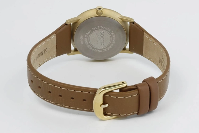Гармоничное сочетание титана и кожи делает этот аксессуар удобным и надежным. Женские наручные часы. Круглый титановый корпус с PVD покрытием. Циферблат с метками в виде арабских цифр. Кожаный ремешок с классической застежкой. Стекло сапфировое. Водозащита 50WR.