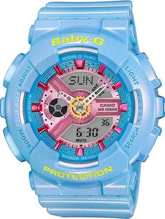Часы с крупным циферблатом и с безельными протекторами будут пользоваться популярностью среди девушек, ведущих активный образ жизни CASIO Baby-G (Касио Беби). Женские часы. Противоударный корпус защищает механизм от ударов и вибрации. Циферблат подсвечивается светодиодом. В часах есть функция послесвечения - подсветка продолжает работать несколько секунд после того как кнопка подсветки была отпущена. Цвет подсветки: оранжевый. Необритовое светонакопительное покрытие обеспечивает длительное послесвечение в темноте даже после кратковременного нахождения на свету. 12-ти и 24-х часовой формат времени. Секундомер с точностью показаний 1/100с и временем измерения 24ч. SPLIT-хронограф. Таймер обратного отсчета от 1мин до 24ч. Мировое время – 48 городов (29 часовых поясов), всемирное координированное время (UTC). Функции включения/отключения летнего времени, включения/отключения звука. Водонепроницаемость 100WR. Стальная задняя крышка крепится на 4-х винтах. Ремешок из полимерного материала с классической застежкой.