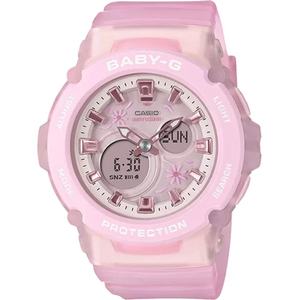 Прекрасный стильный аксессуар, который всегда дополнит и украсит любой ваш образ. Baby-G. Женские часы. Весна в новые начинания и всю обнадеживающую красоту, которую олицетворяют ромашки. Этот цветочный взгляд на культовые изгибы BGA-270 придает совершенно новый шарм. Акценты в виде ромашек и металлические индексы украшают освежающе-шикарный монохромный дизайн. Противоударный корпус защищает механизм от ударов и вибрации. Флуоресцентное напыление на стрелках и дисплее часов позволяет отчетливее видеть каждую цифру. Настраиваемое послесвечение 1,5 или 3сек. Необритовое светонакопительное покрытие обеспечивает длительное послесвечение в темноте даже после кратковременного нахождения на свету. 12-ти и 24-х часовой формат времени. Секундомер с точностью показаний 1с и временем измерения 1ч. SPLIT-хронограф. Таймер обратного отсчета от 1мин до 1ч с автоповтором. Мировое время – 29 часовых поясов (48 городов всемирное координированное время (UTC). Автоматический переход на зимнее и летнее время, возможность включения/отключения данной функции. Батарея рассчитана на 3 года. Задняя крышка крепится на 4-х винтах. Ремешок с классической застежкой.