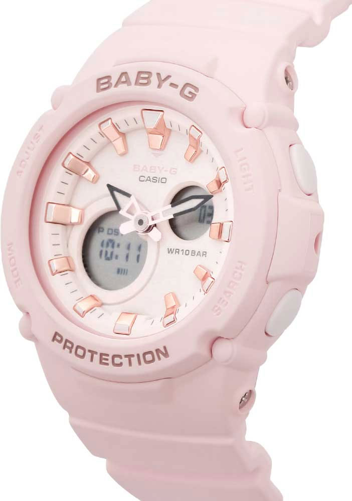 Прекрасный стильный аксессуар, который всегда дополнит и украсит любой ваш образ. Baby-G. Женские часы. Противоударный корпус защищает механизм от ударов и вибрации. Флуоресцентное напыление на стрелках и дисплее часов позволяет отчетливее видеть каждую цифру.Циферблат подсвечивается ярким светодиодом. Послесвечение. Цвет подсветки: белый. Необритовое светонакопительное покрытие обеспечивает длительное послесвечение в темноте даже после кратковременного нахождения на свету. 12-ти и 24-х часовой формат времени. Секундомер с точностью показаний 1с и временем измерения 1ч. SPLIT-хронограф. Таймер обратного отсчета от 1мин до 1ч с автоповтором. Мировое время – 29 часовых поясов (48 городов всемирное координированное время (UTC). Автоматический переход на зимнее и летнее время, возможность включения/отключения данной функции.5 будильников, один с функцией Snooze, ежечасный сигнал Батарея рассчитана на 3 года. Задняя крышка крепится на 4-х винтах. Ремешок с классической застежкой.