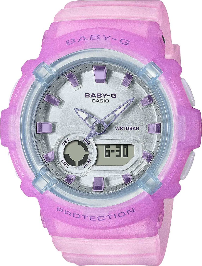 Противоударные кварцевые женские наручные часы Casio BGA-280-6A коллекции Baby-G с двойной индикацией времени. Противоударный корпус защищает механизм от ударов и вибрации. Флуоресцентное напыление на стрелках и дисплее часов позволяет отчетливее видеть каждую цифру.Циферблат подсвечивается ярким светодиодом. Послесвечение. Цвет подсветки: белый. Необритовое светонакопительное покрытие обеспечивает длительное послесвечение в темноте даже после кратковременного нахождения на свету. 12-ти и 24-х часовой формат времени. Секундомер с точностью показаний 1с и временем измерения 1ч. SPLIT-хронограф. Таймер обратного отсчета от 1мин до 1ч с автоповтором.5 будильников, один с функцией Snooze, ежечасный сигнал. Автоматический переход на зимнее и летнее время, Батарея рассчитана на 3 года. Задняя крышка крепится на 4-х винтах. Ремешок с классической застежкой.