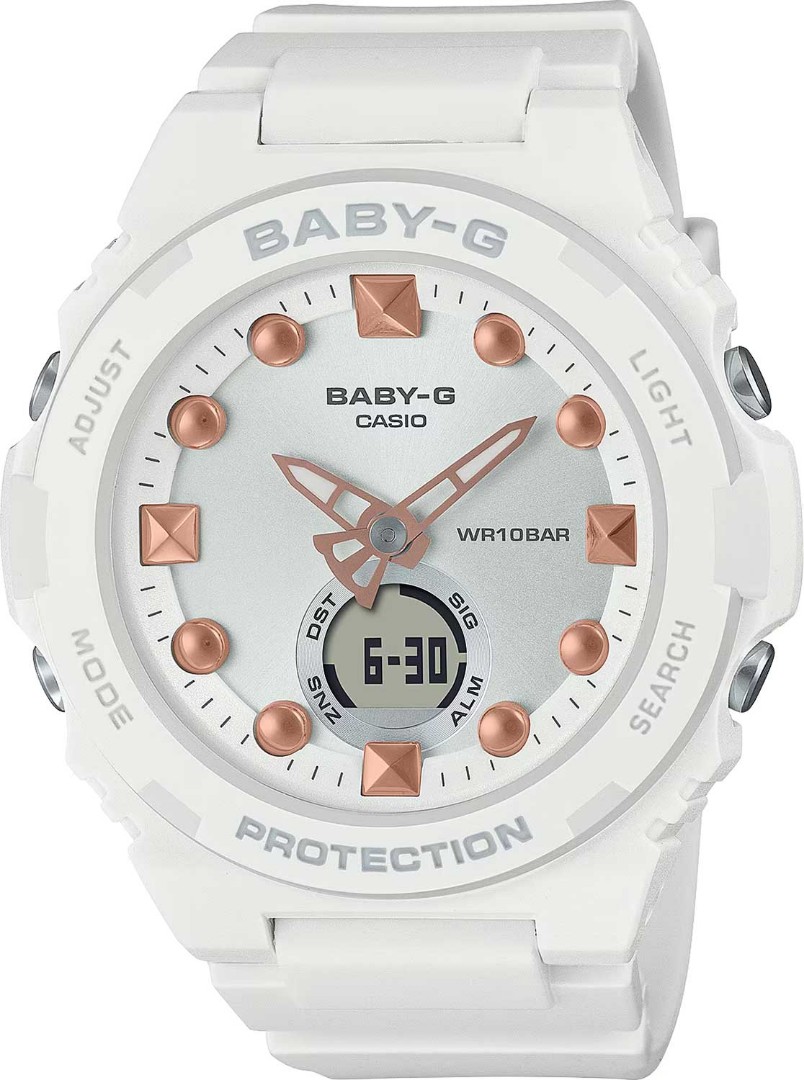 Яркая новинка в коллекции Baby-G отлично подойдет для современных и активных девушек Противоударные кварцевые женские наручные часы Casio BGA-320-7A2 коллекции Baby-G с двойной индикацией времени. Противоударный корпус защищает механизм от ударов и вибрации. Флуоресцентное напыление на стрелках и дисплее часов позволяет отчетливее видеть каждую цифру.Циферблат подсвечивается ярким светодиодом. Послесвечение. Цвет подсветки: белый. Необритовое светонакопительное покрытие обеспечивает длительное послесвечение в темноте даже после кратковременного нахождения на свету. 12-ти и 24-х часовой формат времени. Секундомер с точностью показаний 1с и временем измерения 1ч. SPLIT-хронограф. Таймер обратного отсчета от 1мин до 1ч с автоповтором.5 будильников, один с функцией Snooze, ежечасный сигнал. Мировое время – 27 городов (29 часовых поясов), всемирное координированное время (UTC) Автоматический переход на зимнее и летнее время, Батарея рассчитана на 3 года. Задняя крышка крепится на 4-х винтах. Ремешок с классической застежкой.