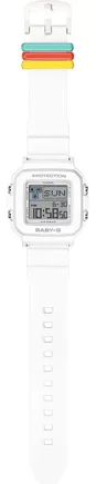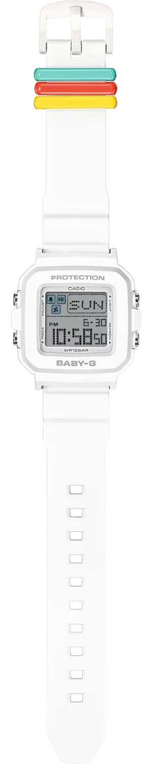 Ремешок с классической застежкой и системой быстрой замены. В комплекте сменные разноцветные петли для ремешка, которые позволят создать свой уникальный образ. Корпус пластик. Звуковой сигнал будильник, ежечасный сигнал. Стекло минеральное. Календарь автоматический: число, день недели, месяц (до 2099г). Водозащита 100WR.