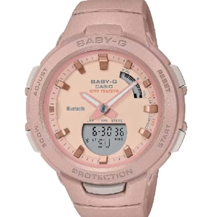 Беспроводная технология Bluetooth® со сверхнизким потреблением энергии для синхронизации со смартфоном. При подключении к смартфону часы корректируют текущее время, а также копируют настройки мирового времени. 3-осевой акселерометр автоматически начинает отсчет шагов на дисплее, когда вы начинаете бегать или участвовать в других действиях во время ношения часов.Шагомер измеряет количество шагов от 0 до 999999. Графическое отображение пройденных шагов за последние 11ч. Установка цели в диапазоне от 1000 до 50000. Звуковое напоминание об отсутствии активности и достижении цели. Приложение BABY-G Connected позволяет настроить параметры для журнала счетчика шагов с пятью уровнями интенсивности упражнений, создавать комбинации таймера и отправлять их на часы, хранить данные измерений секундомера.