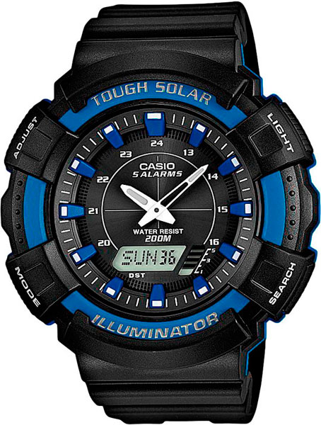 Питание от солнечной энергии, индикатор заряда батареи. Функция автоматического сохранения энергии (отключает LCD дисплей). Время работы аккумулятора без подзарядки - 10 месяцев, при включенной функции сохранения энергии - 23 месяцев. Секундомер с точностью показаний 1/100с и временем измерения 1ч. Два таймер обратного отсчета времени от 5с до 100мин с устанавливаемым количеством повторов от 1 до 10. Мировое время. 12-ти и 24-х часовой формат времени. Шесть языков отображения дня недели: английский, португальский, испанский, французский, немецкий и итальянский. Функция включения/отключения звука. 5 будильников, ежечасный сигнал.