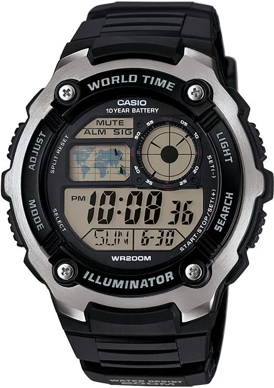 Циферблат подсвечивается светодиодом. Мировое время – 48 городов (31 часовой пояс), всемирное координированное время (UTC). Функция включения/отключения летнего времени. 12-ти и 24-х часовой формат времени. Секундомер с точностью показаний 1/100 сек и временем измерения 24 часа. Сплит-хронограф. Таймер обратного отсчета от 1мин до 24ч. Функция включения/отключения звука.