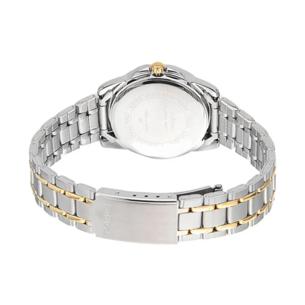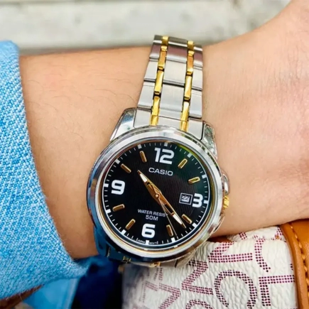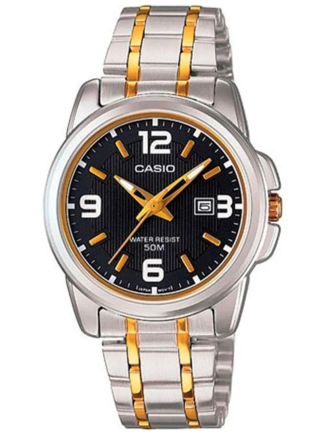 Часы Casio (Касио) отличный аксессуар в стиле casual. Классический сдержанный дизайн, круглый стальной корпус. Стрелки часов покрыты безопасным люминесцентным покрытием, которое светится в темноте. На циферблате присутствует индикация текущей даты. На браслет частично нанесено стойкое PVD покрытие. Браслет стальной с раскладывающейся застежкой. Стекло минеральное. Водозащита 50WR.