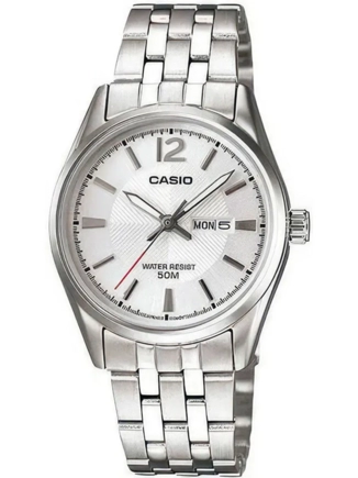Часы Casio (Касио) отличный аксессуар в стиле casual. Классический сдержанный дизайн, круглый стальной корпус. Стрелки часов покрыты безопасным люминесцентным покрытием, которое светится в темноте. На циферблате присутствует индикация текущей даты и дня недели. Браслет стальной с раскладывающейся застежкой. Стекло минеральное. Водозащита 50WR.