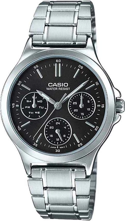 Часы Casio (Касио) отличный аксессуар, который дополнит Ваш деловой образ в повседневной жизни.Модные и женственные часики станут идеальным вариантом для повседневного общения со временем. Collection. Женские часы. 12-ти и 24-х часовой формат времени, число и день недели вынесены на отдельные циферблаты. Метки в виде штрихов. Заводная головка с защитой. Браслет с тройной раскладывающейся застежкой.