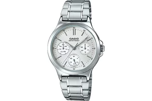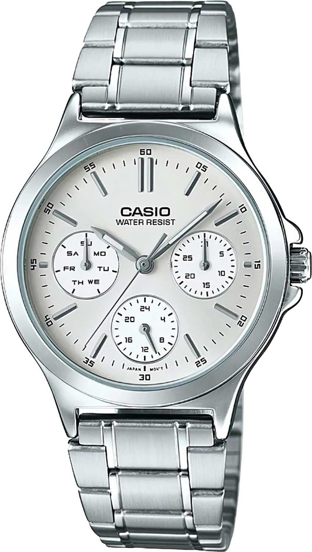 Часы Casio (Касио) отличный аксессуар, который дополнит Ваш деловой образ в повседневной жизни.Модные и женственные часики станут идеальным вариантом для повседневного общения со временем. Collection. Женские часы. 12-ти и 24-х часовой формат времени, число и день недели вынесены на отдельные циферблаты. Метки в виде штрихов. Заводная головка с защитой. Браслет с тройной раскладывающейся застежкой.