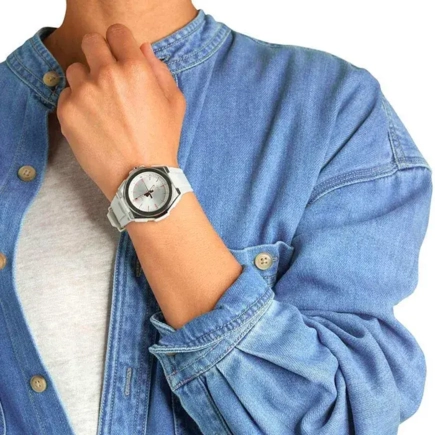 Заводная головка с защитой. Корпус из нержавеющей стали и полимерного пластика. Ремешок из полимерного материала с классической застежкой. Водозащита 100WR.