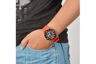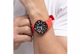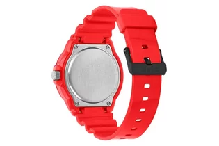 Стальная задняя крышка крепится на 4-х винтах. Ремешок из полимерного материала с классической застежкой. Водозащита 100WR.