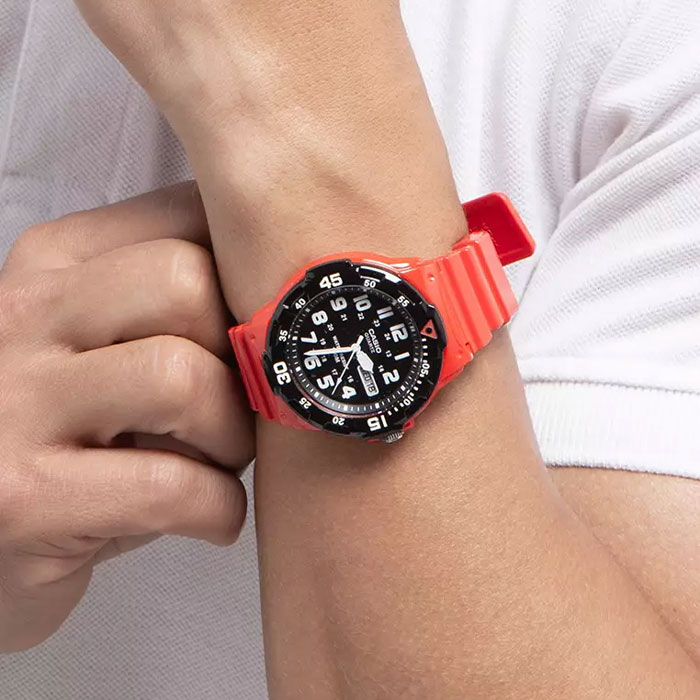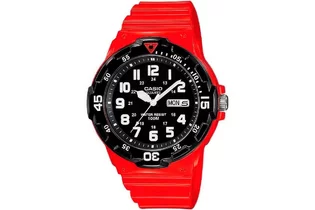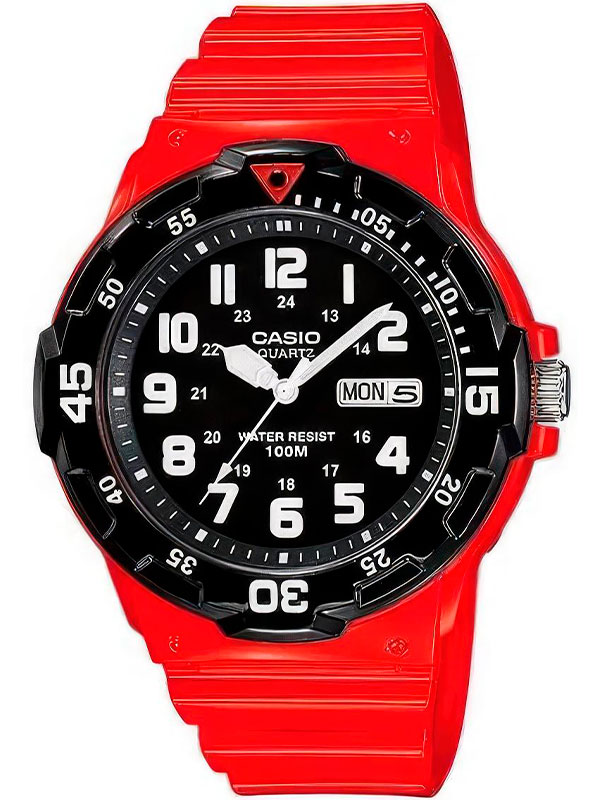 Часы Casio (Касио) Мужские кварцевые наручные часы в круглом пластиковом корпусе. Безель с минутной шкалой вращается в одном направлении. Индикация числа, дня недели. Метки в виде арабских цифр. Люминесцентное покрытие стрелок и цифр.