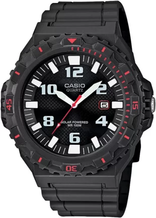 Часы Casio (Касио) Мужские кварцевые наручные часы на солнечной батарее в круглом пластиковом корпусе. Вращающийся безель. Индикация числа, дня недели. Метки в виде арабских цифр. Люминесцентное покрытие стрелок и цифр.