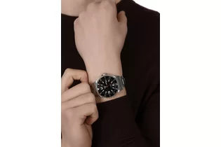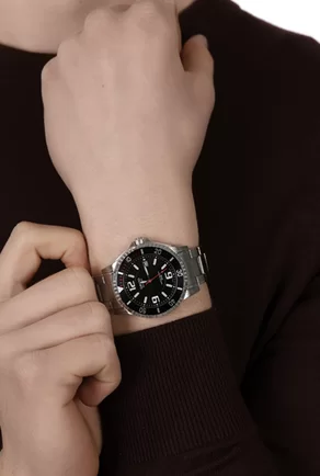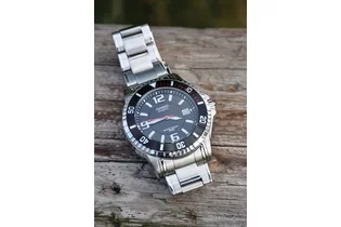 Завинчивающаяся заводная головка с защитой. Задняя крышка с винтовым фиксатором. На корпус частично нанесено PVD покрытие черного цвета. Браслет с тройной раскладывающейся застежкой.Водозащита 200WR.
