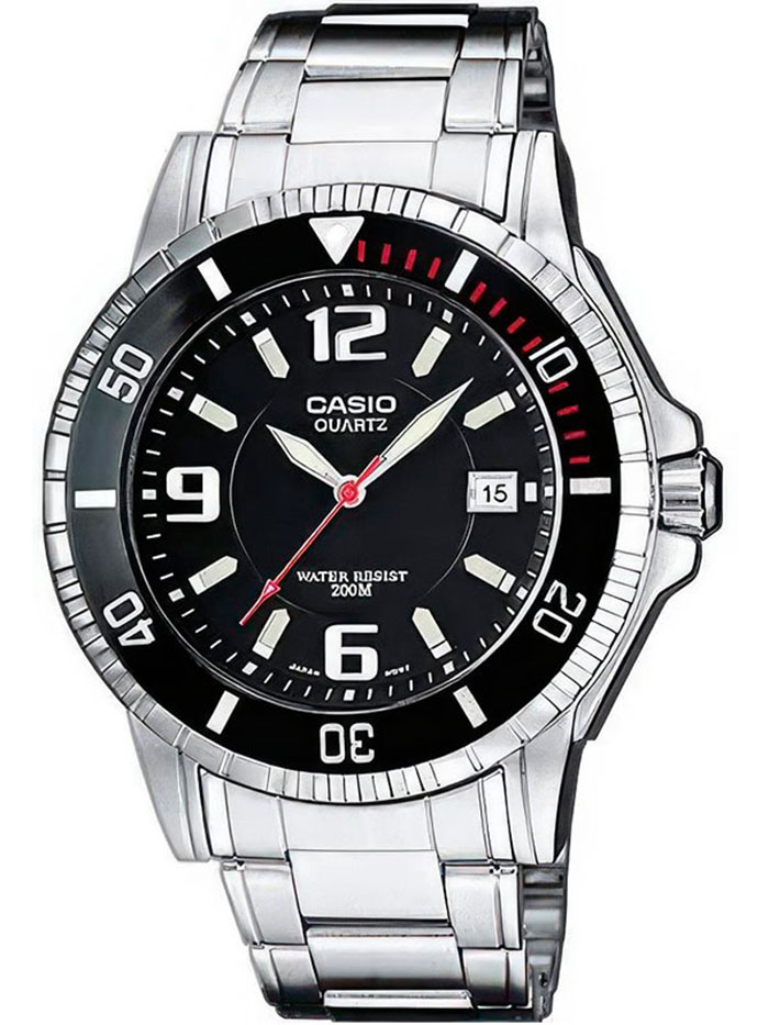 Часы Casio (Касио) Мужские кварцевые наручные часы подходит для глубокого погружения под воду. Безель вращается в одном направлении. На циферблате отображается дата. Стрелки и цифры покрыты люминесцентным напылением (светятся в темноте).
