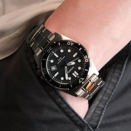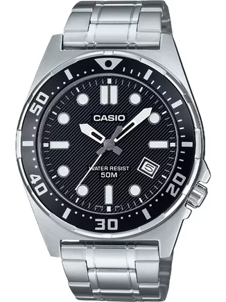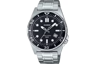 Часы Casio (Касио) Мужские кварцевые наручные часы. Однонаправленный вращающийся безель. На циферблате отображается текущая дата. Стрелки и метки покрыты люминесцентным напылением (светятся в темноте).