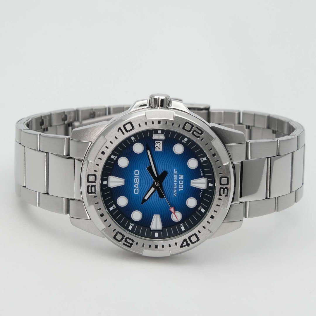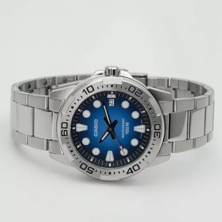 Часы Casio (Касио) Мужские кварцевые наручные часы. Однонаправленный вращающийся безель. На циферблате отображается текущая дата. Стрелки и метки покрыты люминесцентным напылением (светятся в темноте).