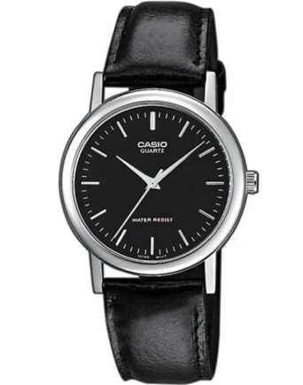 Часы Casio (Касио) в стальном корпусе, отличный аксессуар в стиле casual, на черном кожаном ремешке. Стекло минеральное. Водозащита 30WR.