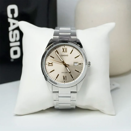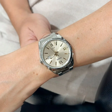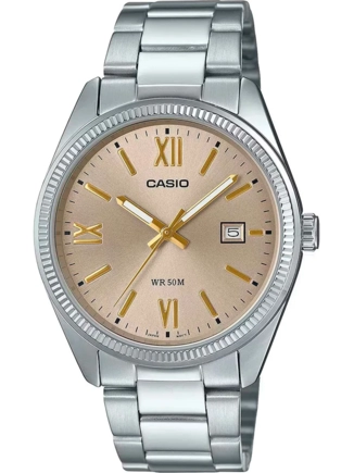 Часы Casio (Касио) классический характер, круглый корпус. Эти часы созданы для мужчин, которые ценят комфорт и практичность. На данной модели отображается дата. На стрелки нанесен накапливающий свет флуоресцирующий материал, за счет которого обеспечивается свечение стрелок в темноте. Стальной браслет. Раскладывающаяся застежка, расстегиваемая одним касанием. Водозащита 50WR.