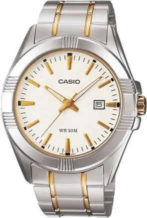 Часы Casio (Касио) классический характер, круглый корпус. Эти часы созданы для мужчин, которые ценят комфорт и практичность. На стрелки нанесен накапливающий свет флуоресцирующий материал, за счет которого обеспечивается свечение стрелок в темноте. Стекло минеральное, устойчивое к повреждениям и царапинам. Корпус и браслет из нерж.стали. На браслет частично нанесено стойкое PVD покрытие. Раскладывающаяся застежка, расстегиваемая одним касанием. Водозащита 50WR.