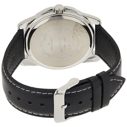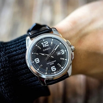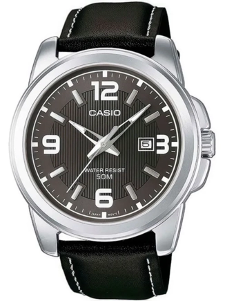 Часы Casio (Касио) классический характер, круглый корпус. Эти часы созданы для мужчин, которые ценят комфорт и практичность. Циферблат с метками в виде штрихов и арабских цифр. На данной модели отображается текущая дата. На стрелки нанесен накапливающий свет флуоресцирующий материал, за счет которого обеспечивается свечение стрелок в темноте. Стекло минеральное, устойчивое к повреждениям и царапинам. Корпус из нерж.стали. Ремешок из натуральной кожи. Классическая застежка из нержавеющей стали. Водозащита 50WR.