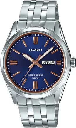 Часы Casio (Касио) классический характер, круглый корпус. Эти часы созданы для мужчин, которые ценят комфорт и практичность. Циферблат с метками в виде штрихов и арабских цифр. На данной модели отображается день недели и текущая дата. На стрелки нанесен накапливающий свет флуоресцирующий материал, за счет которого обеспечивается свечение стрелок в темноте. Стекло минеральное, устойчивое к повреждениям и царапинам. Корпус и браслет из нерж.стали. Браслет с тройной раскладывающейся застежкой, расстегиваемой одним касанием. Водозащита 50WR.