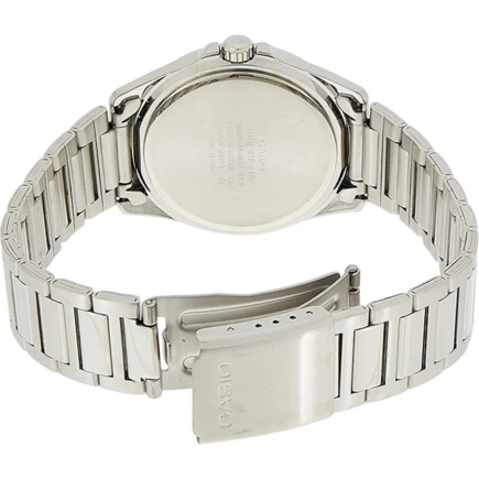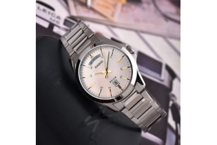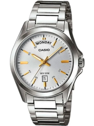 Часы Casio (Касио) классический характер, круглый корпус. Эти часы созданы для мужчин, которые ценят комфорт и практичность. Циферблат с метками в виде штрихов. На данной модели отображается день недели и текущая дата. На стрелки нанесен накапливающий свет флуоресцирующий материал, за счет которого обеспечивается свечение стрелок в темноте. Стекло минеральное, устойчивое к повреждениям и царапинам. Корпус и браслет из нерж.стали. Браслет с тройной раскладывающейся застежкой, расстегиваемой одним касанием. Водозащита 50WR.