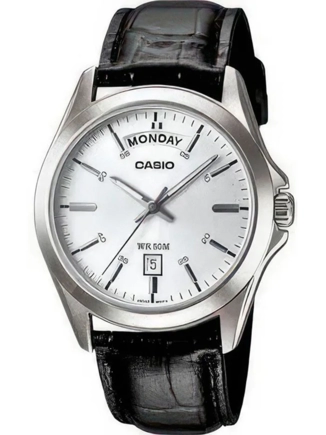 Часы Casio (Касио) классический характер, круглый корпус. Эти часы созданы для мужчин, которые ценят комфорт и практичность. Циферблат с метками в виде штрихов. На данной модели отображается день недели и текущая дата. На стрелки нанесен накапливающий свет флуоресцирующий материал, за счет которого обеспечивается свечение стрелок в темноте. Стекло минеральное, устойчивое к повреждениям и царапинам. Корпус из нерж.стали. Ремешок из натуральной кожи. Классическая застежка из нержавеющей стали. Водозащита 50WR.
