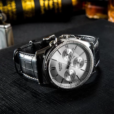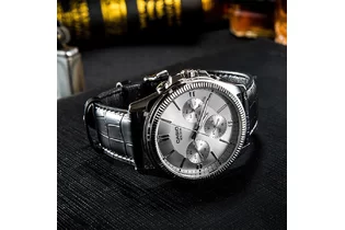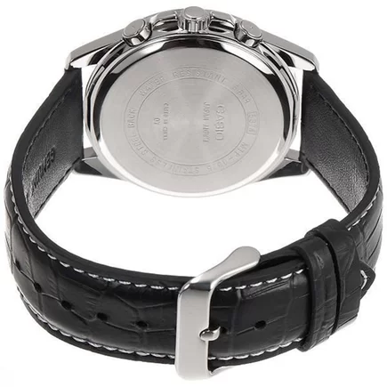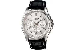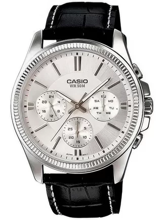 Часы Casio (Касио) классический характер, круглый корпус. Эти часы созданы для мужчин, которые ценят комфорт и практичность. 12-ти и 24-х часовой формат времени, число и день недели вынесены на отдельные циферблаты. Метки в виде штрихов и арабской цифры 12. Заводная головка с защитой. На стрелки нанесен накапливающий свет флуоресцирующий материал, за счет которого обеспечивается свечение стрелок в темноте. Стекло минеральное, устойчивое к повреждениям и царапинам. Корпус из нерж.стали. Ремешок из натуральной кожи. Классическая застежка из нержавеющей стали. Водозащита 50WR.