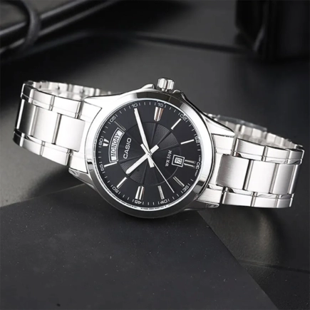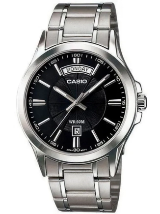 Часы Casio (Касио) классический характер, круглый корпус. Эти часы созданы для мужчин, которые ценят комфорт и практичность. На данной модели отображается день недели и текущая дата. Метки в виде штрихов. Заводная головка с защитой. На стрелки нанесен накапливающий свет флуоресцирующий материал, за счет которого обеспечивается свечение стрелок в темноте. Стекло минеральное, устойчивое к повреждениям и царапинам. Корпус и браслет из нерж.стали. Браслет с тройной раскладывающейся застежкой, расстегиваемой одним касанием. Водозащита 50WR.