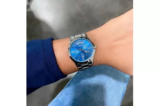 На данной модели отображается день недели и текущая дата. Метки в виде штрихов. Заводная головка с защитой. На стрелки нанесен накапливающий свет флуоресцирующий материал, за счет которого обеспечивается свечение стрелок в темноте. Стекло минеральное, устойчивое к повреждениям и царапинам. Корпус и браслет из нерж.стали. Браслет с тройной раскладывающейся застежкой, расстегиваемой одним касанием. Водозащита 50WR.