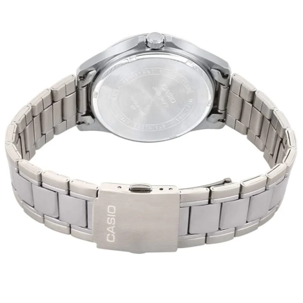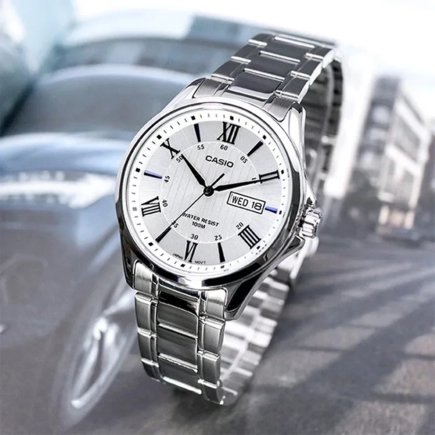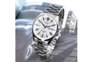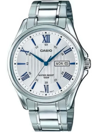 Часы Casio (Касио) классический характер, круглый корпус. Эти часы созданы для мужчин, которые ценят комфорт и практичность. На данной модели отображается день недели и текущая дата. Метки в виде римских цифр. Заводная головка с защитой. Стекло минеральное, устойчивое к повреждениям и царапинам. Корпус и браслет из нерж.стали. Браслет с тройной раскладывающейся застежкой, расстегиваемой одним касанием. Водозащита 100WR.