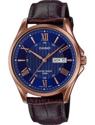 Часы Casio (Касио) классический характер, круглый корпус. Эти часы созданы для мужчин, которые ценят комфорт и практичность. На данной модели отображается день недели и текущая дата. Метки в виде римских цифр.На корпус нанесено стойкое PVD покрытие. Заводная головка с защитой. Стекло минеральное, устойчивое к повреждениям и царапинам. Корпус из нерж.стали. Ремешок из натуральной кожи. Классическая застежка из нержавеющей стали.