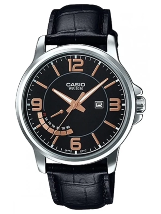 Часы Casio (Касио) классический характер, круглый корпус. Эти часы созданы для мужчин, которые ценят комфорт и практичность. На данной модели отображается день недели и текущая дата. Циферблат с метками в виде штрихов и арабских цифр. Заводная головка с защитой. Стекло минеральное, устойчивое к повреждениям и царапинам. Корпус из нерж.стали. Ремешок из натуральной кожи. Классическая застежка из нержавеющей стали.