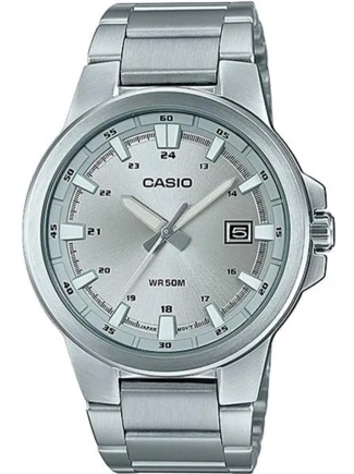 Часы Casio (Касио) классический характер, круглый корпус. Эти часы созданы для мужчин, которые ценят комфорт и практичность. Классическая цветовая гамма и универсальный дизайн модели позволяет сочетать её с любым мужским гардеробом. На данной модели отображается дата. Метки в виде штрихов. Kорпус и браслет из нерж.стали. Браслет с тройной раскладывающейся застежкой, расстегиваемой одним касанием. Стекло минеральное, устойчивое к повреждениям и царапинам. Водозащита 50WR.