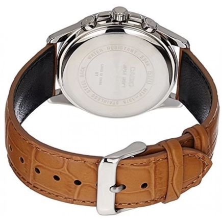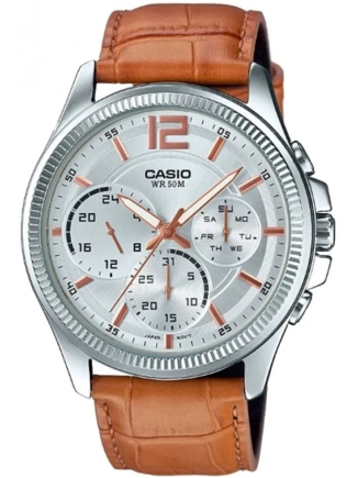 Часы Casio (Касио), круглый корпус. Эти часы созданы для мужчин, которые ценят комфорт и практичность. На данной модели отображается текущая дата и день недели. Отображение времени в формате 12/24 в формате am/pm на электронном дисплее; дополнительное окошко со стрелкой, указывающей на порядок часа (например, 10 утра или 22 часа вечера) - для аналоговых циферблатов. Стрелки покрыты люминесцентным напылением (светятся в темноте). Метки в виде штрихов. Kорпус из нерж.стали. Ремешок из натуральной кожи. Классическая застежка из нержавеющей стали. Стекло минеральное, устойчивое к повреждениям и царапинам. Водозащита 50WR.