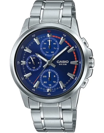Часы Casio (Касио), круглый корпус. Эти часы созданы для мужчин, которые ценят комфорт и практичность. На данной модели отображается текущая дата и день недели. Отображение времени в формате 12/24 в формате am/pm; дополнительное окошко со стрелкой, указывающей на порядок часа (например, 10 утра или 22 часа вечера) - для аналоговых циферблатов. Стрелки покрыты люминесцентным напылением (светятся в темноте). Метки в виде штрихов. Kорпус и браслет из нерж.стали. Браслет с тройной раскладывающейся застежкой, расстегиваемой одним касанием.Стекло минеральное, устойчивое к повреждениям и царапинам. Водозащита 50WR.