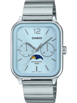 Часы Casio (Касио), До Луны и обратно — отслеживайте фазы Луны с помощью эффектных аналоговых часов с несколькими встроенными циферблатами. Эти часы сочетают в себе стильный дизайн и классический лунный дизайн. На данной модели 3 стрелки (час, минута, секунда), 3 циферблата (дата, день недели, фаза Луны)текущая дата. Метки в виде штрихов. Kорпус и браслет из нерж.стали. Браслет с тройной раскладывающейся застежкой, расстегиваемой одним касанием. Стекло минеральное, устойчивое к повреждениям и царапинам. Водозащита 50WR.