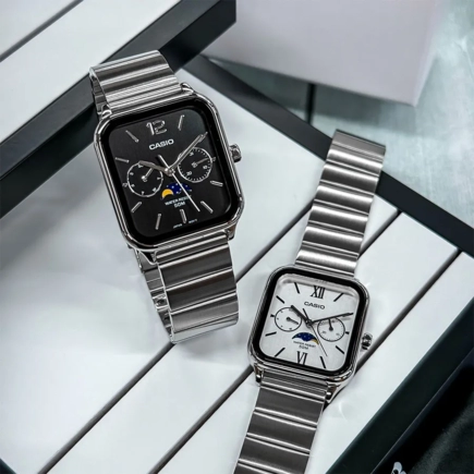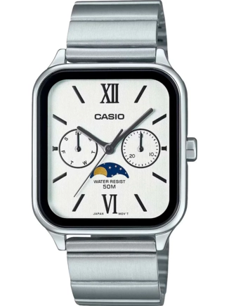Часы Casio (Касио), До Луны и обратно — отслеживайте фазы Луны с помощью эффектных аналоговых часов с несколькими встроенными циферблатами. Эти часы сочетают в себе стильный дизайн и классический лунный дизайн. На данной модели 3 стрелки (час, минута, секунда), 3 циферблата (дата, день недели, фаза Луны)текущая дата. Метки в виде штрихов. Kорпус и браслет из нерж.стали. Браслет с тройной раскладывающейся застежкой, расстегиваемой одним касанием. Стекло минеральное, устойчивое к повреждениям и царапинам. Водозащита 50WR.