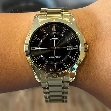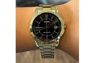 Часы Casio (Касио) классический характер, круглый корпус. Эти часы созданы для мужчин, которые ценят комфорт и практичность. На данной модели отображается текущая дата. Метки в виде. Стекло минеральное, устойчивое к повреждениям и царапинам. Корпус из нерж.стали. На корпус и браслет нанесено стойкое покрытие. Браслет с тройной раскладывающейся застежкой, расстегиваемой одним касанием. Водозащита WR.