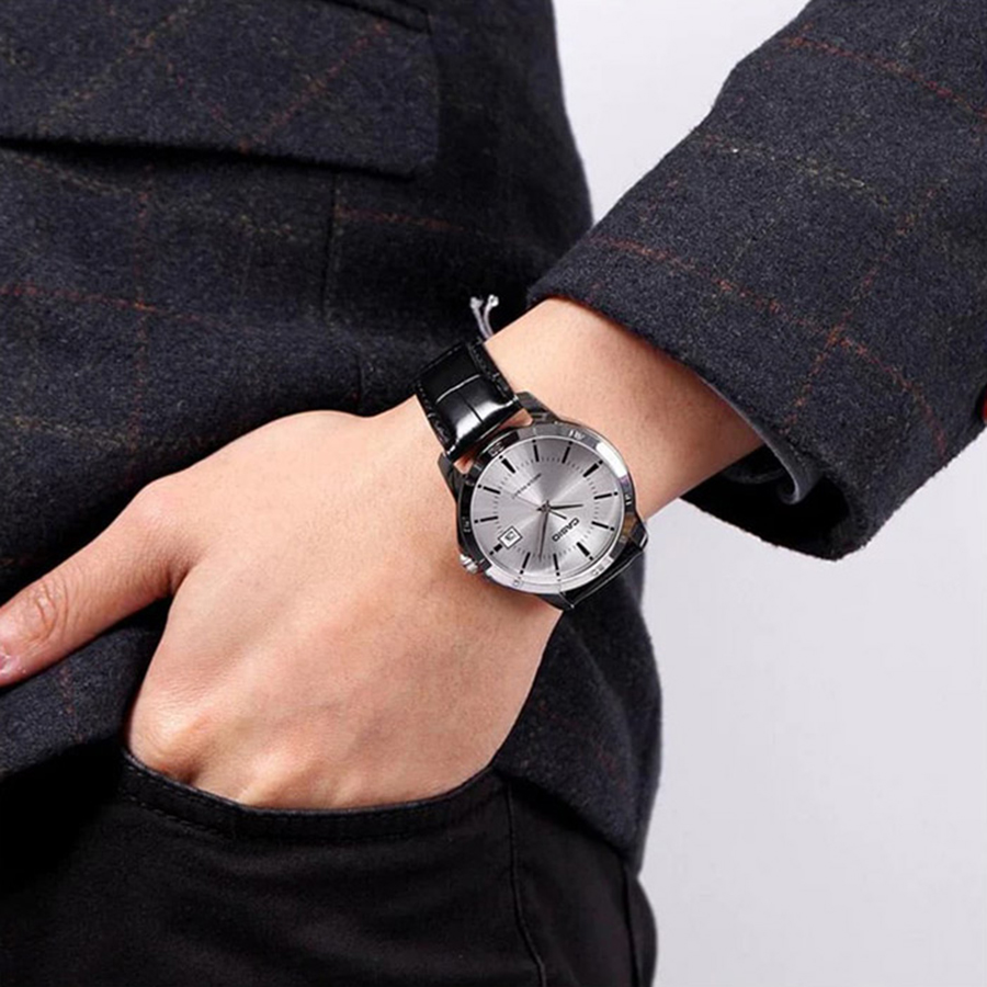 Часы Casio (Касио) классический характер, круглый корпус. Эти часы созданы для мужчин, которые ценят комфорт и практичность. На данной модели отображается текущая дата. Метки в виде штрихов. Стекло минеральное, устойчивое к повреждениям и царапинам. Корпус из нерж.стали. Ремешок из натуральной кожи. Классическая застежка из нержавеющей стали. Водозащита WR.