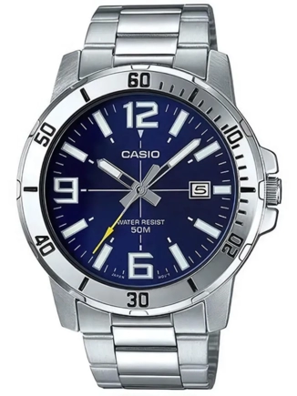 Часы Casio (Касио) практичные часы для стильных мужчин, которые ценят комфорт и практичность. На данной модели отображается текущая дата. Циферблат с метками в виде штрихов и арабских цифр. На стрелки и метки нанесен накапливающий свет флуоресцирующий материал, за счет которого обеспечивается свечение стрелок в темноте. Заводная головка с защитой. Корпус и браслет выполнен из нержавеющей стали. Стекло минеральное, устойчивое к повреждениям и царапинам. Браслет с тройной раскладывающейся застежкой, расстегиваемой одним касанием. Водозащита 50WR.