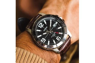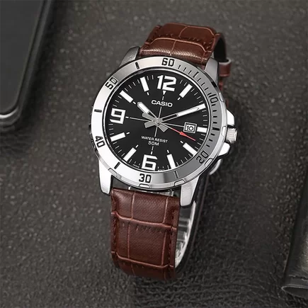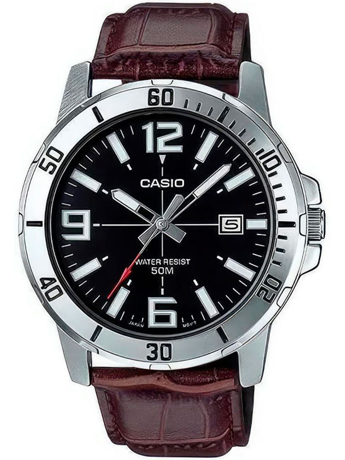 Часы Casio (Касио) практичные часы для стильных мужчин, которые ценят комфорт и практичность. На данной модели отображается текущая дата. Циферблат с метками в виде штрихов и арабских цифр. На стрелки и метки нанесен накапливающий свет флуоресцирующий материал, за счет которого обеспечивается свечение стрелок в темноте. Заводная головка с защитой. Корпус выполнен из нержавеющей стали. Стекло минеральное, устойчивое к повреждениям и царапинам. Ремешок из натуральной кожи. Классическая застежка из нержавеющей стали. Водозащита 50WR.