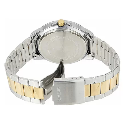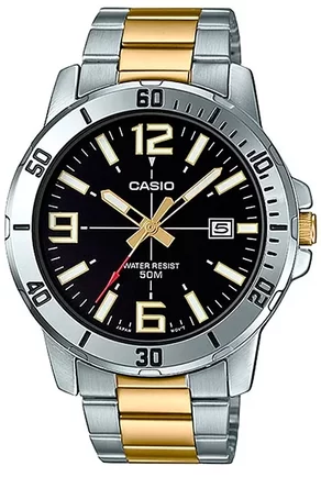 Часы Casio (Касио) практичные часы для стильных мужчин, которые ценят комфорт и практичность. На данной модели отображается текущая дата. Циферблат с метками в виде штрихов и арабских цифр. На стрелки и метки нанесен накапливающий свет флуоресцирующий материал, за счет которого обеспечивается свечение стрелок в темноте. Заводная головка с защитой. Корпус и браслет выполнен из нержавеющей стали. На браслет и корпус нанесено стойкое PVD покрытие. Стекло минеральное, устойчивое к повреждениям и царапинам. Браслет с тройной раскладывающейся застежкой, расстегиваемой одним касанием. Водозащита 50WR.