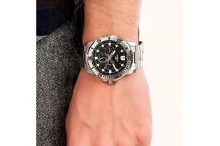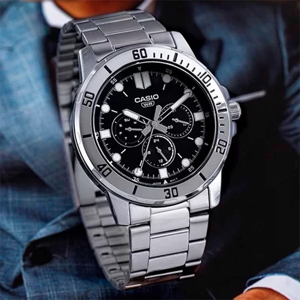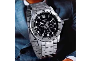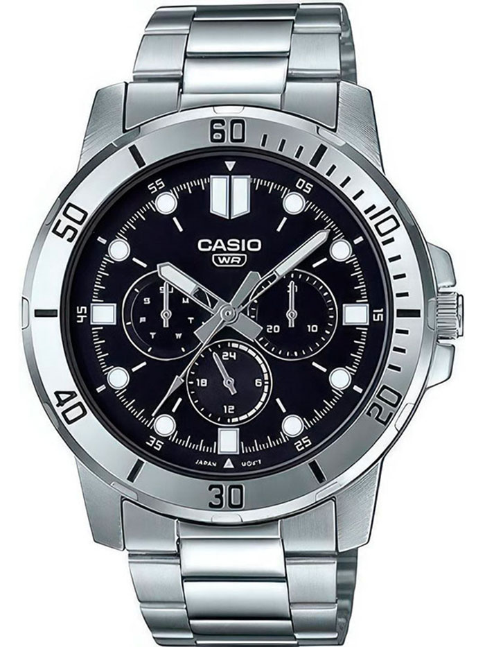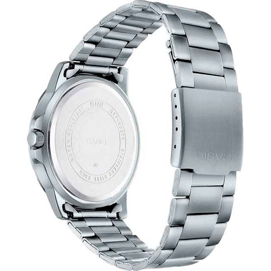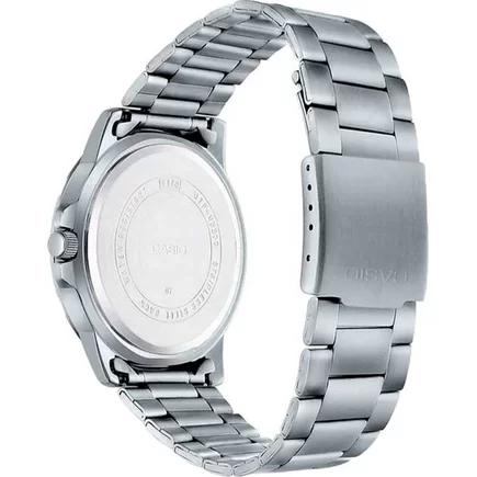 Часы Casio (Касио) практичные часы для стильных мужчин, которые ценят комфорт и практичность. 12-ти и 24-х часовой формат времени, число и день недели вынесены на отдельные циферблаты. Метки в виде точек. На стрелки и метки нанесен накапливающий свет флуоресцирующий материал, за счет которого обеспечивается свечение стрелок в темноте. Корпус и браслет выполнен из нержавеющей стали. Стекло минеральное, устойчивое к повреждениям и царапинам. Заводная головка с защитой. Браслет с тройной раскладывающейся застежкой, расстегиваемой одним касанием. Водозащита 30WR.