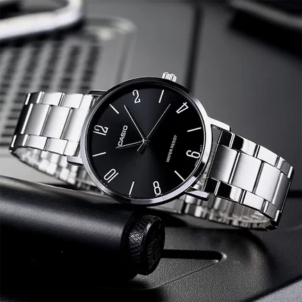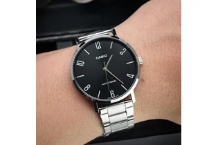 Часы Casio (Касио) практичные часы для стильных мужчин, которые ценят комфорт и практичность. Циферблат в виде штрихов и арабских цифр. Стекло минеральное, устойчивое к повреждениям и царапинам. Корпус и браслет выполнен из нержавеющей стали. Браслет с тройной раскладывающейся застежкой, расстегиваемой одним касанием. Водозащита 30WR.