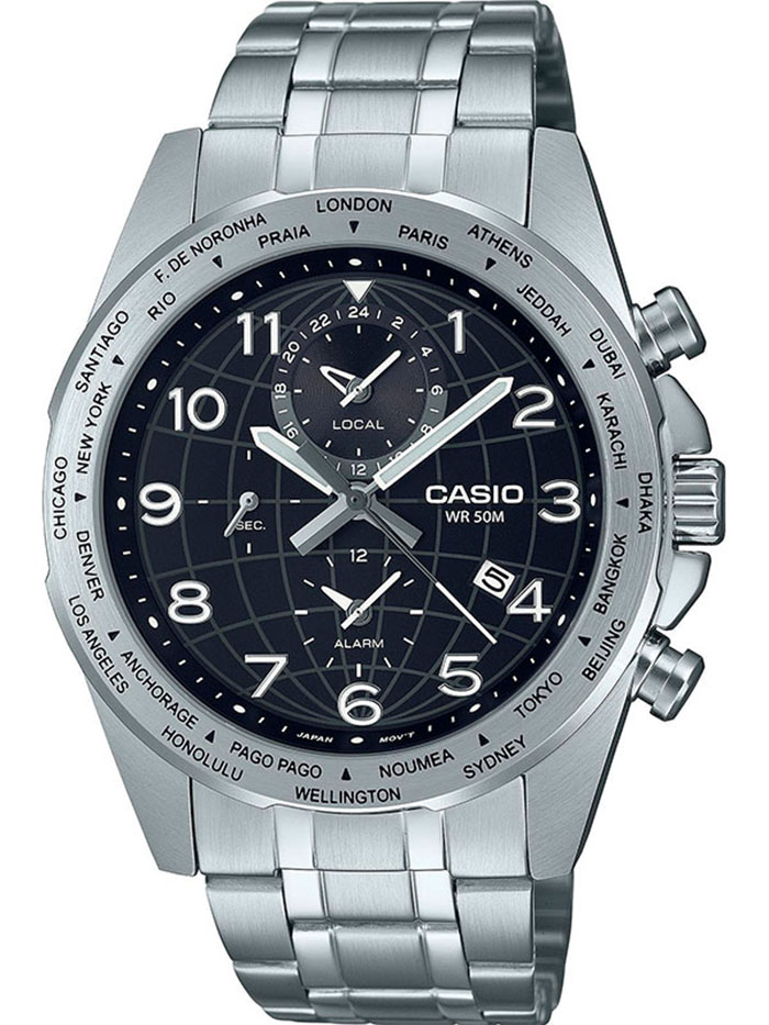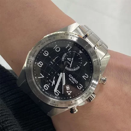 На данной модели отображается текущая дата. Мировое время в 24 городах (24 часовых пояса), двойное время (24-х часовой дополнительный циферблат), будильник, индикатор низкого уровня заряда батареи. Стрелки покрыты люминесцентным напылением (светятся в темноте).