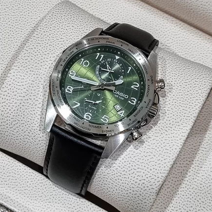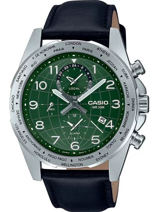 На данной модели отображается текущая дата. Мировое время в 24 городах (24 часовых пояса), двойное время (24-х часовой дополнительный циферблат), будильник, индикатор низкого уровня заряда батареи. Стрелки покрыты люминесцентным напылением (светятся в темноте).