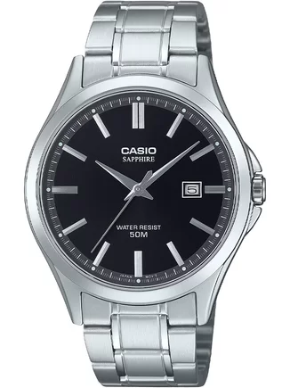 Часы Casio (Касио) практичные часы для стильных мужчин, которые ценят комфорт и практичность. На данной модели отображается текущая дата. Циферблат с метками в виде штрихов. Корпус и браслет выполнен из нержавеющей стали. Сапфировое стекло устойчивое к царапанию. Заводная головка с защитой. Браслет с тройной раскладывающейся застежкой, расстегиваемой одним касанием. Водозащита 50WR.